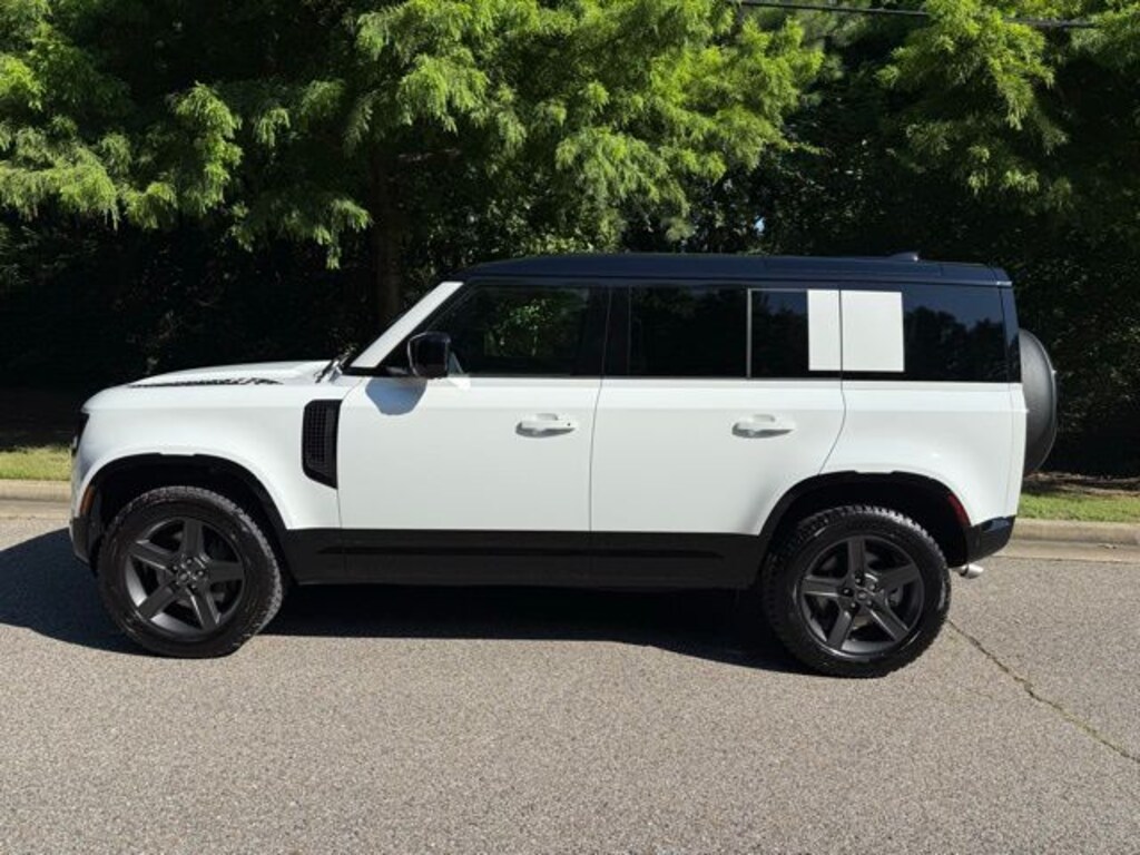 Fuji White 2025 Land Rover Defender 110 X-Dynamic SE X-Dynamic SE AWD 8-Speed Automatic V8 Supercharged 12-Way Heated and Cooled Electric Memory Front Seats, 15 Speakers, 3-Zone Climate Control, 4-Wheel Disc Brakes, ABS brakes, Adaptive suspension, Air Conditioning, Air Quality Sensor, Alloy wheels, AM/FM radio: SiriusXM, Apple CarPlay & Android Auto, Auto High-beam Headlights, Auto tilt-away steering wheel, Auto-dimming door mirrors, Auto-dimming Rear-View mirror, Automatic temperature control, Body-Colored Spare Wheel Cover, Brake assist, Bumpers: body-color, Cabin Air Purification Plus, Compass, Delay-off headlights, Driver door bin, Driver vanity mirror, Dual front impact airbags, Dual front side impact airbags, Electronic Stability Control, Exterior Parking Camera Rear, Four wheel independent suspension, Front anti-roll bar, Front Bucket Seats, Front Center Armrest, Front dual zone A/C, Front fog lights, Front reading lights, Fully automatic headlights, Garage door transmitter: HomeLink, Handover Pack, Head-Up Display, Headlight cleaning, Heated door mirrors, Heated front seats, Heated steering wheel, Illuminated entry, Low tire pressure warning, Memory seat, Navigation system: Connected Navigation PIVI Pro, Occupant sensing airbag, Outside temperature display, Overhead airbag, Overhead console, Panic alarm, Passenger door bin, Passenger vanity mirror, Power door mirrors, Power driver seat, Power moonroof, Power passenger seat, Power steering, Power windows, Premium Interior Protection and Storage Package (5 Seat), Radio data system, Radio: Meridian Surround Sound System, Rain sensing wipers, Rear anti-roll bar, Rear fog lights, Rear reading lights, Rear seat center armrest, Rear window defroster, Rear window wiper, Remote keyless entry, Resist Seat Trim, Security system, Speed control, Speed-sensing steering, Speed-Sensitive Wipers, Split folding rear seat, Steering wheel memory, Steering wheel mounted audio controls, Tachometer, Telescoping steering wheel, Tilt steering wheel, Tow Hitch Receiver, Traction control, Trip computer, Variably intermittent wipers, Ventilated front seats, Weather band radio, Wheels: 20" Gloss Sparkle Silver Style 5098, Wheels: 20" Satin Dark Grey Style 5094.